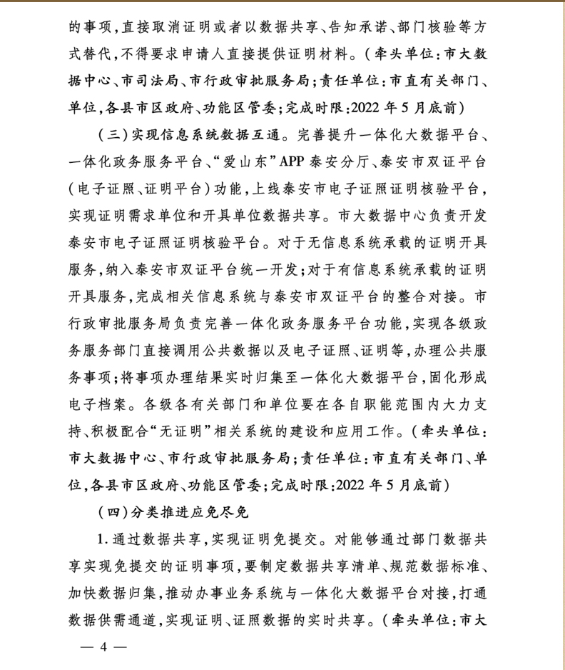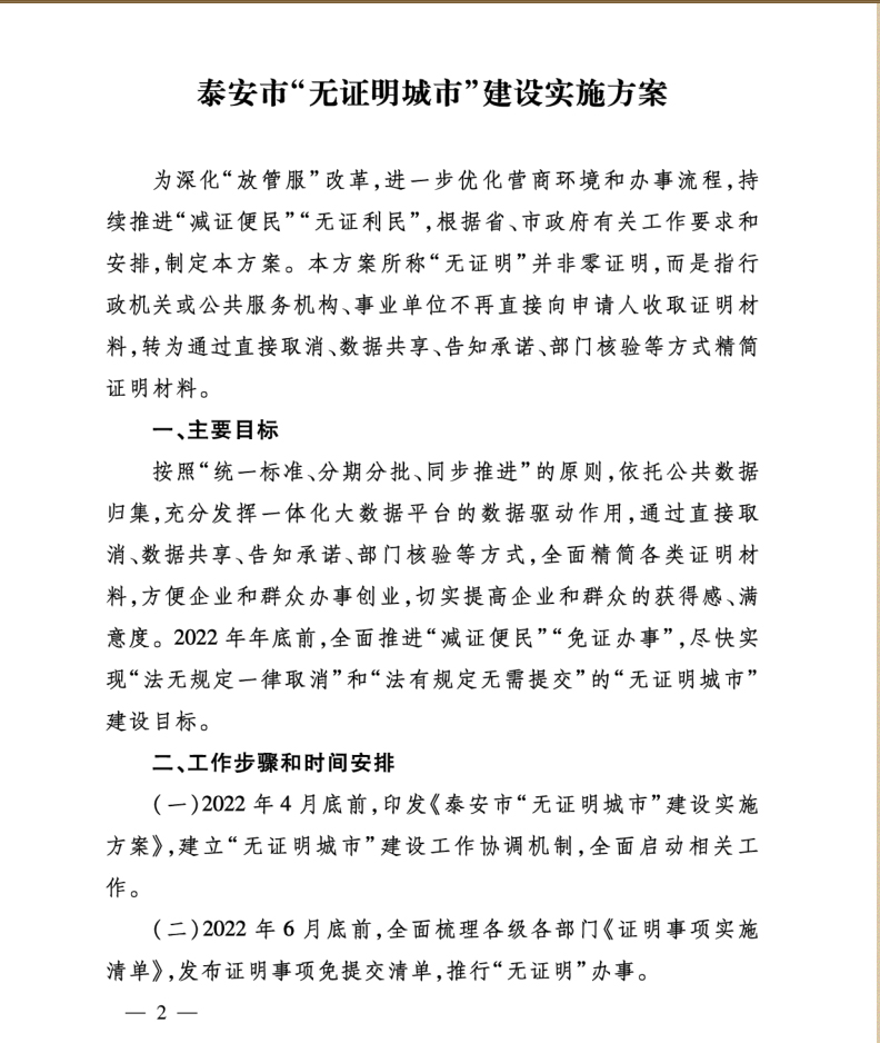 您當前位置》政策法規》泰安市人民政府辦公室關于印發泰安市“無證明城市”建設實施方案的通知